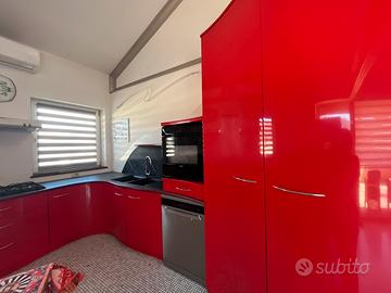 Vendo cucina in legno colore rosso, tenuta bene, compresa di forno, lavandino, fornelli. Misura 3mx3m circa...