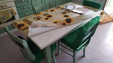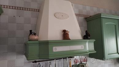 Cucina in legno massello verde brillante, con tavolo allungabile fino a 6 posti, n.4 sedie, cappa aspirante e mobile credenza a prezzo conveniente.