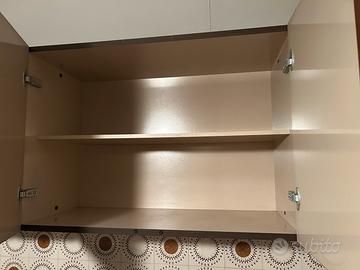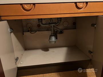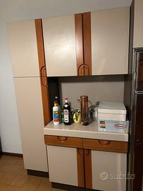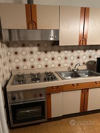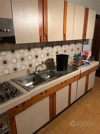 Vendesi spaziosa cucina completa in autentico stile vintage anni '80, caratterizzata da un design con ante color crema, profili in legno. La cucina si compone di un ampio blocco lineare che ospita la zona lavello a doppia vasca in acciaio inox, il piano cottura, completato da numerosi pensili superiori. A corredo è presente un secondo blocco separato molto funzionale che include la colonna per il frigorifero e una capiente zona dispensa con cassettoni e vani contenitori. I mobili si presentano in buone condizioni strutturali ed estetiche, mentre gli elettrodomestici NON sono funzionanti. Ideale per taverne e case vacanze o piccole case. PREZZO TRATTABILE