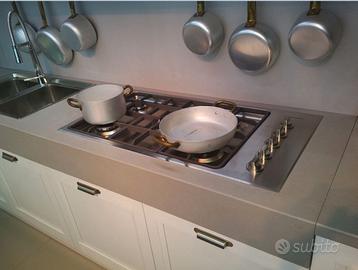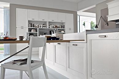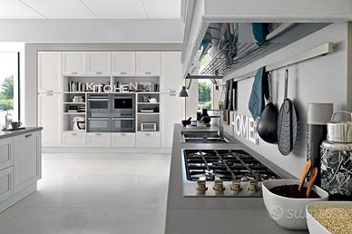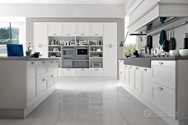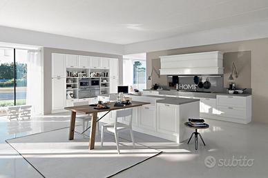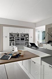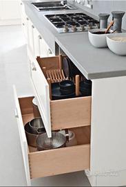 Composizione studiata per ambienti molto grandi, realizzata in occasione del lancio del nuovo catalogo..Interni cassetti in faggio massello su guide Blum,,top 4 vm in Olite, elettrodomestici di alta gamma...Lavastoviglie Smeg da 90 cm