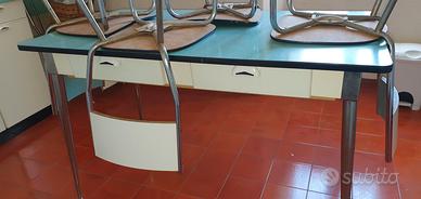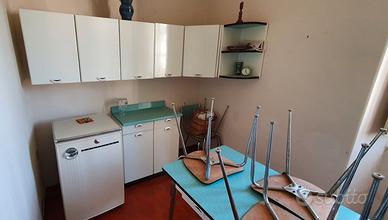 Cucina Salvarani con base e pensili più frigorifero anni 60 perfettamente funzionante con guarnizione da cambiare. Completa di tavolo con 6 sedie. Colore verde acqua con motivo come in foto.
