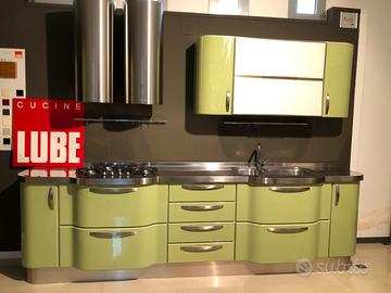 Cucina elegante e moderna LUBE laccata lucida ricca di particolari per veri amanti del genere. La cucina é completa di elettrodomestici Ariston, piano Foster elettrofuso, 2 cappe Faber. Misure : blocco forno e frigo:1.33 m. Blocco piano cottura e lavello 3.20. Vendita per rinnovo esposizione. Trasporto e montagio entro 50km tutto compreso nel prezzo.