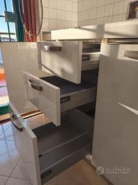 - Ante dei pensili di colore bianco lucido con maniglie di colore argento (per un design semplice e lineare) e top di 6cm bianco opaco.