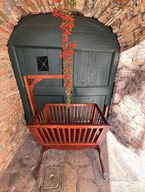 Splendida culla a dondolo vintage in legno massello, finemente lavorata e in eccellenti condizioni. Caratterizzata da una struttura a sospensione con braccio superiore integrato (ideale per zanzariera o decorazioni). Perfetta come pezzo d'arredo per una nursery classica, come porta-bambole da collezione o come elemento decorativo rustico per vetrine e studi. Legno sano, senza segni di tarli, finitura lucida originale.