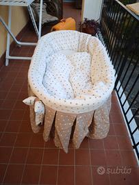 Culla in bamboo e vimini, completa di materasso e rivestimento su misura. Come foto. Misure 57x97 82h.