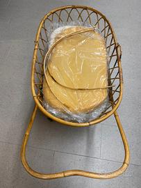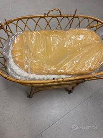 Culla in vimini “Anni 80”. Misure: lunghezza 88 con manico 108 larghezza 52 altezza 68. Completa di materasso e rivestimento color bianco.