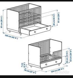 Bellissimo lettino turchese unisex Myllra IKEA 60x120 con cassetto. Completo di materasso a molle 60x120x12, in più proteggi materasso impermeabile. Se serve regalo piumino, set lenzuola completo bianco e celeste con nuvolette. Il letto presenta piccoli segni d'usura.