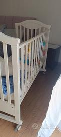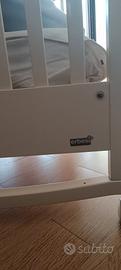 culla colore avorio/bianco latte con cassettone e spalliere laterali rimuovibili e regolabili in altezza.