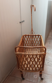 Vendo deliziosa culla in vimini e rafia risalente agli anni 50 completa di bastone porta velo removibile e rotelline originali dell' epoca.