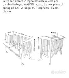 Letto con decoro in legno naturale o letto per bambini in legno WALDIN laccato bianco, piano di appoggio EXTRA lungo. 90 x larghezza. 55 cm, bianco