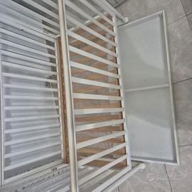 Doppia spondina abbassibile. Cassettone sotto culla a due scomparti. qualche graffietto, ottime condizioni.
