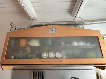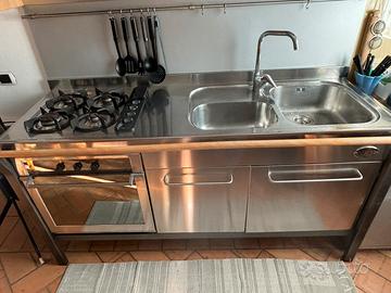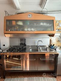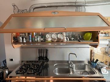 Cucina AIKO modello STUFA anni 90 in acciaio e legno composta da due blocchi Blocco inferiore con fornello a gas con forno elettrico statico, ventilato e con grill sopra e sotto, lavandino con 2 vasche e con 2 ante sotto. Blocco superiore con un’anta che si apre verso l’alto con due ripiani con cappa e scolapiatti. La cucina è usata ma in buone condizioni. Io la sto usando ma dovrò liberare lo spazio per un nuovo arredo. Sono da sistemare i fuochi del gas: non funziona l’accendigas elettronico e vanno puliti i fuochi. Lo sportello in alto resta aperto attualmente con un listello di legno. Vanno sostituiti i pistoncini laterali che consentono l’apertura automatica e l’accensione delle luci interne. La cucina è lunga cm 180. La parte bassa è alta cm 90 e profonda cm 60. La parte superiore è alta cm 70 e profonda 30/40. Chi è interessato all’acquisto dovrà farsi carico del trasporto.