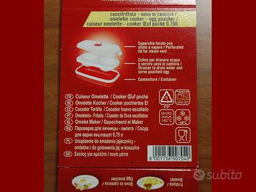 Cuoci uova e frittate a microonde Snips. Lavabile in lavastoviglie max 45°, utilizzabile in frigorifero e freezer fino a - 18° gradi. Vassoio intermedio con due sedi tonde per cucinare uova in camicia e all’occhio di bue. 0% BPA e PHTHALATE FREE, usato pochissimo, prezzo richiesto € 5,00. Della stessa linea ho anche in vendita il Cuoci riso e cereali a microonde, se interessati posso fare un solo annuncio e quindi unica spedizione.