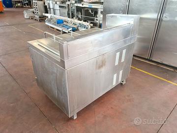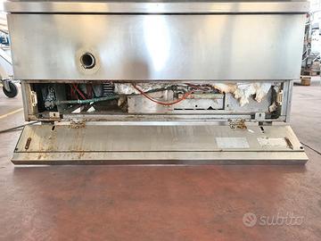 cuocipasta automatico usato, si tratta di un bollitore a gas in acciaio inox di cui non conosciamo la marca (logo in foto) mod. ACP15DF1 del 1998 con cestello scolapasta a sollevamento meccanico programmabile a seconda dei tipi di cottura richiesti e timer sonoro, utile per cottura di grandi quantità di pasta o verdure.