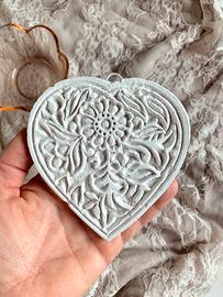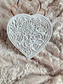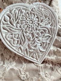 Decorazione in gesso alabrastrino con gancio per appenderlo. Ha la possibilità di essere profumato ed é venduto con le descrizioni su comenrinnovare la profumazione. Pezzo unico, ottenuto dal calco di un timbro artigianale Indiano. Originale idea regalo