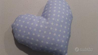 Raffinati cuori in tessuto di cotone celeste a pois bianchi imbottiti in fibra sintetica. Realizzati interamente a mano. Misurano cm 9 di larghezza e 8 cm di altezza circa.