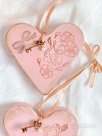 Tre cuori in polvere di gesso rosa, realizzati a mano con anticatura a cera e decorati con timbri ed elementi come perle e chiavi. Hanno tutti il nastrino per essere appesi e la possibilità di essere profumati. Ottima idea regalo