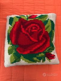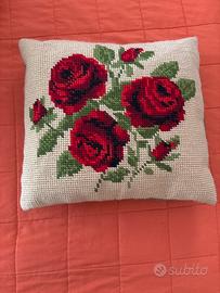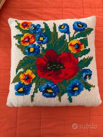Cuscini da arredo con motivi floreali realizzati interamente a mano con ricamo su un lato. Euro 50 cad. Euro 220 per l’acquisto di 5 pezzi.