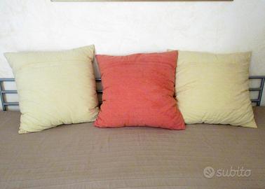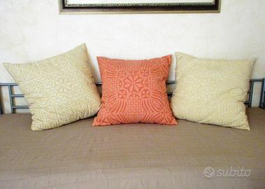 Cuscini in stile etnico in cotone, con motivi a rilievo e zip posteriore per lavaggio fodera e cuscino. NON USATI. Dimensioni 50x50 cm pagati 23 euro l'uno.