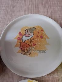 Set composto da un cuscino di Biancaneve e un peluche di Brontolo, più due piatti decorativi con i nani Mammolo.
