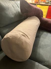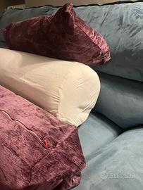 Cuscini per divano, due viola in ciniglia e uno cilindrico bianco in cotone (diametro 25cm lunghezza 90)
