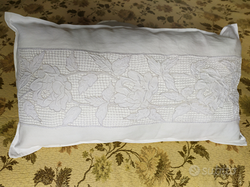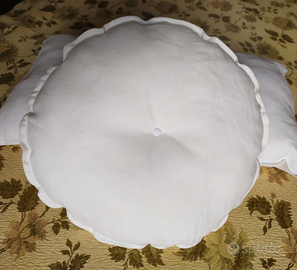 Vendesi n°2 coppie di cuscini in lino imbottiti e confezionati a mano: quelli rotondi di diametro 35 cm presentano al centro un'applicazione ricamata all'uncinetto e bottoncino in perla; quelli rettangolari di misure 56x33 cm presentano un inserto ad intaglio. Ideali per abbellire un divano o un letto. Il prezzo s'intende per la coppia e comprende una eventuale spedizione.