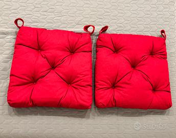 2 cuscini per sedie da interno e/o da giardino. Rosso/bordeaux con laccetti. Misura 38x38 cm Come nuovi, mai usati.