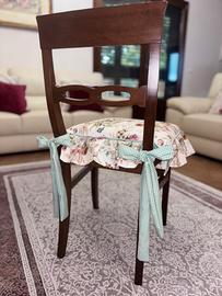 Cuscini per sedie artigianali di alta qualità in cotone e sfoderabili, la spugna è doppia e resistente, i lacci doppi e i volant intorno permettono di rendere la sedia più raffinata, il prezzo si riferisce a un pacco da 6 cuscini. Scegli la colorazione che fa al caso tuo.