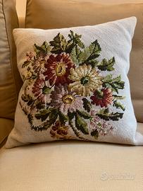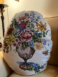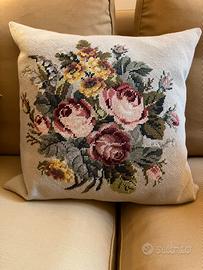 Cinque cuscini ricamati a mano , in filo di lana a piccolo punto, imbottitura in piuma nuova, mai usati, molto decorativi e comodi. Misura ovale 56 x 46, quadrati 40x40.prezzo cuscino ovale 50 euro, quadrato 30, tutti 150.