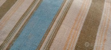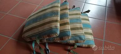 4x cuscini a righe, stoffa giallo/verde/celeste tappezzeria, forma trapezio poiché utilizzati in origine per sedie Cesca Gavina (49x44x38cm).