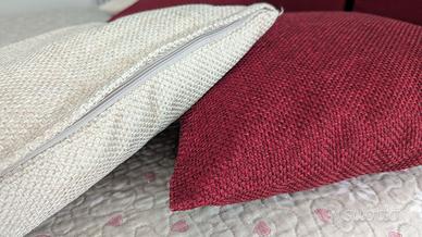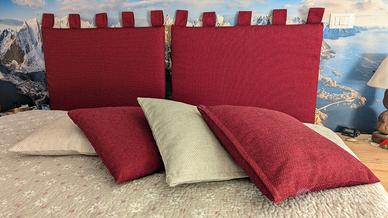 2 cuscini testiera letto bordeaux + 2 fodere cuscini color écru + 4 fodere cuscini bordeaux. Tutto lavabile in lavatrice. I 2 cuscinoni che fanno da testiera letto hanno le asole da appendere a bastone per tende. Sono stati confezionati a mano da una sarta. Sono sfoderabili per il lavaggio in lavatrice della fodera che si apre comodamente con il velcro, vedi foto. Misure per ogni cuscinone : larghezza 86 cm. Altezza 75 cm. comprese le asole.