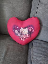 Vendo cuscino a forma di cuore con immagine di due gatti e scritta "Ti amo!"