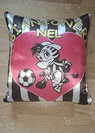 Vendo simpatico cuscino decorativo a strisce bianche e nere, perfetto per la cameretta o per il divano di un piccolo (o grande!) tifoso.
