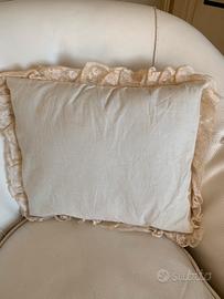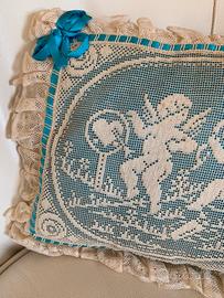 Splendido cuscino con angioletti in pizzo filè antico con sfondo azzurro fodera in lino 35cmx29cm