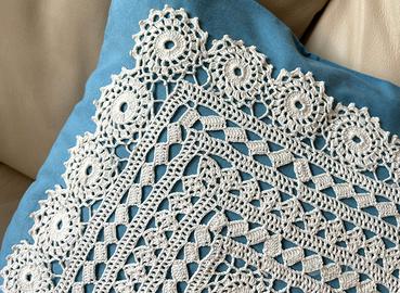 Interamente realizzato a mano, è in tessuto di cotone azzurro e sul davanti ha un inserto di cotone bianco finemente lavorato all’uncinetto.