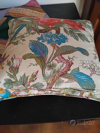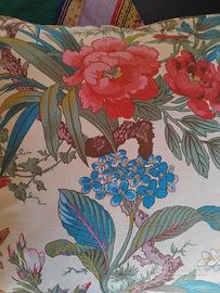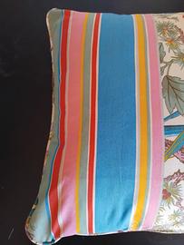 Design Unico e Raro:Un lato presenta un motivofloreale esotico e lussureggiantecon peonie rosse e fiori azzurri in stile chintz su un fondo chiaro, vibrante e ricco di dettagli. L'altro lato è impreziosito da un audace e modernopannello a righe multicolori(rosa shocking, azzurro, giallo, verde e rosso), creando un contrasto eclettico di grande impatto visivo.