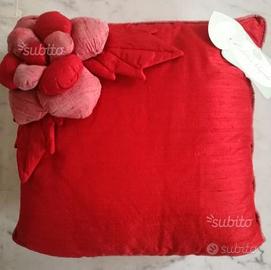 Importante cuscino realizzato in shantung di seta in colore rosso. La particolarità di questo cuscino è il decoro di fiore con petali imbottiti.