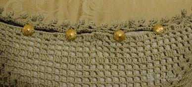 Cuscino all'uncinetto fatto a mano con lana bicolore per arredare - idea regalo. La condizione "Nuovo". Cuscino all'uncinetto fatto a mano, bicolore, moro e beige, con lana acrilica. Puoi arredare qualsiasi angolo della tua casa. Lavorazione in altorilievo, chiusura con bottoni in metallo e contornato di pon pon lavorati sempre all'uncinetto. Fronte e retro lavorato differente come vedete nelle foto. Le misure del cuscino sono cm52x48. Fatevi un bel regalo.