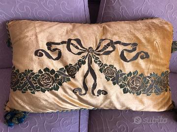 Cuscino in velluto di seta stampato a mano di artigianato veneziano . Misure 77x55 rifinito con passamanerie di pregio e imbottitura.Produttore il Fondaco di Venezia . Il prezzo di vendita al pubblico era di ? 358,00 , adesso è in vendita a ? 10,00