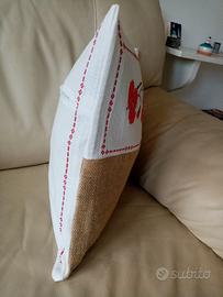 La parte anteriore è per metà in Tela Aida bianca ricamata a mano a punto croce e per metà in iuta.