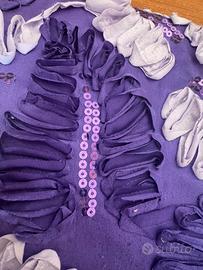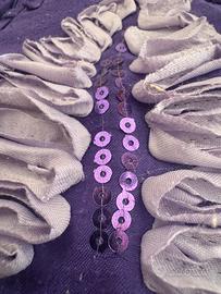 Cuscino quadrato sfoderabile, misure 40x40, fodera sintetica. Design decorativo con volant applicati e paillettes su uno sfondo viola intenso. Superficie decorata con nastri di tessuto arricciati nei toni del lilla chiaro e del viola scuro, disposti in motivi che ricordano piume o foglie. Piccole paillettes viola cucite lungo i bordi delle applicazioni.