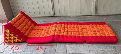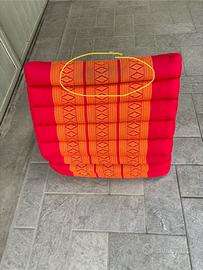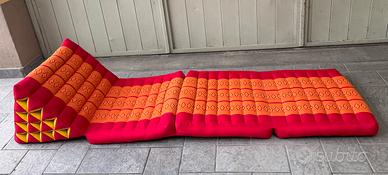 Cuscino/materassino thai in kapok con 3 elementi pieghevoli; dalle foto si vede qualche difetto (macchia) che secondo me è lavabile.