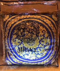 Lussuoso e introvabile cuscino Versace Atelier nei toni dell'azzurro e del giallo oro a motivo barocco, completamente sfoderabile, cordoncino di raso tutt'intorno