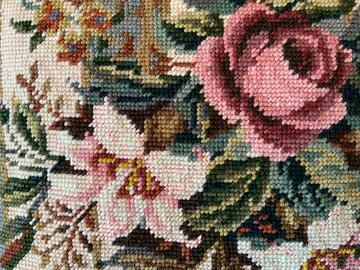 Vendo un cuscino vintage realizzato a mano a mezzopunto con filato di lana e particolari con filato di seta. Il kit di base è stato prodotto da Ehrman Tapestry su disegno di Kaffe Fassett, famoso artista tessile statunitense. Raffigura un variopinto mazzo di fiori su uno sfondo a righe quale fosse una tappezzeria. Il kit risale agli anni ‘90 e attualmente non risulta più in produzione. Il cuscino misura cm 40 x 40 e viene venduto già completo di imbottitura. Il retro è costituito da un tessuto di cotone tinta unita. Il cuscino è sfoderabile. Le condizioni sono perfette e l’esecuzione del mezzo punto è impeccabile. Il cuscino è immediatamente utilizzabile. Un lavoro di vero artigianato che dà un tocco cozy all’angolo di casa in cui viene collocato. Il prezzo richiesto è 150 euro.