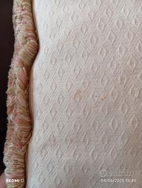 Appena scontato! Cuscino vintage lavorato a mano con filati di cotone. Fantasia a roselline sul fronte, finitura con passamaneria intonata sul bordo, retro in tessuto monocromo beige. Piccole macchinette sul retro, vedi foto.