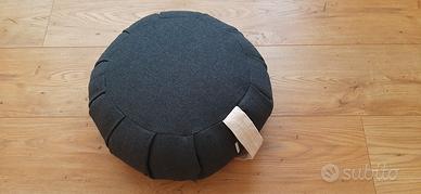Cuscino zafu in cotone antracite, manico in canapa antica, imbottitura naturale in pula di farro. Non sfoderabile.