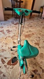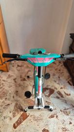 Questa cyclette è un pezzo di design iconico degli anni '80, un modello vintage della linea "Silhouette" prodotta dall'azienda francese Gaubert-Bretin, distribuita in Italia con il marchio Cinzia. Ecco le sue caratteristiche principali: •Estetica Retrò: Il telaio è realizzato in tubolari metallici bianchi con un design minimale ed essenziale. Il colore distintivo di questo modello è il verde acquamarina utilizzato per la scocca centrale, la sella e il cruscotto. •Cruscotto Meccanico: Sul manubrio è presente una console in plastica che ospita la strumentazione originale: Un tachimetro/contachilometri analogico con lancetta rossa. Un timer manuale a rotella per impostare la durata dell'allenamento. Una manopola centrale per regolare la resistenza della pedalata. •Sella Ergonomica: Presenta una sella ampia e sagomata in materiale plastico morbido, tipica delle cyclette domestiche dell'epoca, pensata per il comfort più che per le prestazioni sportive. •Struttura: La base è dotata di piedini in gomma nera per garantire stabilità e proteggere il pavimento. La ruota anteriore è a vista, integrata nella scocca in plastica. È un oggetto molto apprezzato oggi dai collezionisti di modernariato, sia come attrezzo per un esercizio leggero sia come elemento d'arredo per ambienti in stile vintage o industrial.