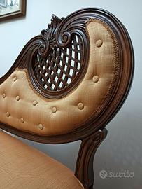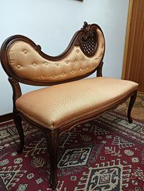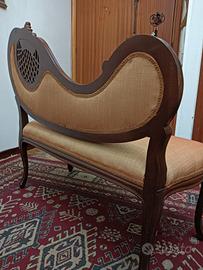 Come da foto, vendo raffinato divano Liberty di piccole dimensioni in stile cosiddetto a gondola, per via della forma dello schienale. Il legno è il mogano finemente intagliato e traforato. Dimensioni: lunghezza 116 cm, Profondità 60 cm, altezza 112 cm. Prezzo: 250 euro. Per qualsiasi informazione, scrivere su Subito oppure al numero 3291964438 (anche WhatsApp).