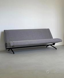 Divano letto reclinabile "D70", prodotto da Tecno, Milano 1954. Struttura tubolare nera con imbottitura in gommapiuma e pomelli in ottone, per regolare l'altezza dello schienale e della seduta del divano. Rivestito in tessuto originale (antitarme). Sia lo schienale che la seduta possono essere reclinati in modo tale che il divano risulti completamente piatto come un letto. Include tutti gli adesivi e i badge originali Tecno.