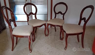 Vendo quattro sedie in legno con seduta imbottita rifatta da poco. Acquistabili anche singolarmente, tre sedie sono in buono stato (prezzo: €15 l'una), una ha lo schienale leggermente ballerino (€5). Prezzo se acquistate tutte insieme: €40.